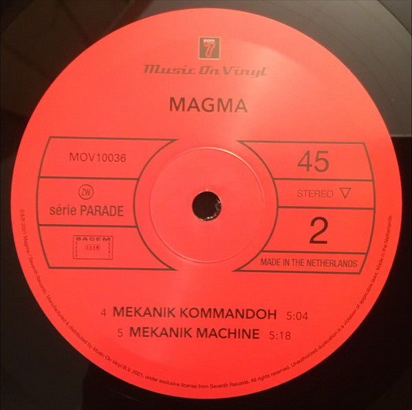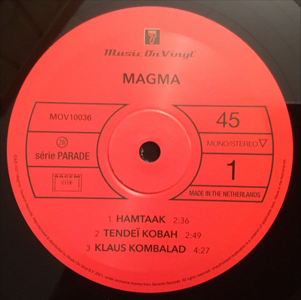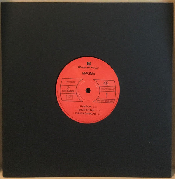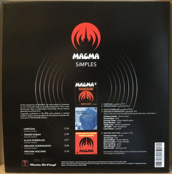 Record Store Day Exclusive Standard black vinyl release, with the cover packaged in a resealable plastic sleeve with hype stickers. Music On Vinyl Magma 'Simples' Three of their most sought after 7inches now available together on one 10inch for the very first time! Limited numbered edition of 1.500 copies 180 gram audiophile vinyl ©&℗ 2021 Magma / Seventh Records Made in the Netherlands Collection of 5 tracks originally released on 7" singles (1971-1974): Tracks 1 and 2 recorded in 1971: [r4722495 Tracks 3 and 4 recorded in 1972 (recorded live during the radio show "Carré bleu") [r2684851 Track 5 recorded in 1974. [m558828 Remastered in 2020 ... at Greasy records studio Side 1 - Mono/Stereo Side 2 - Stereo The distribution credited to Bertus do not appear on this release, but is supplied by Seventh Records.