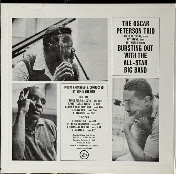 MGM Record Manufacturing Division pressing denoted by block-shaped "S" stamped in runouts. Issued on black Verve® Records "T" non-deep groove labels. Catalog number V-8476 on gatefold jacket. Catalog number V/8476 in label matrices. Title on labels: Bursting Out With The All-Star Big Band Track A5 title on back cover: Dahoud Recorded in New York City on June 13, 14, 15, 26 & 28, 1962. Track publishers: A1: Regal Recordings Ltd. (BMI) A2: Jazz Standard Music (BMI) A3: Burke & Van Heusen, Inc. (ASCAP) A4: Irving Berlin Music (BMI) A5: Brent Music (BMI) B1: Orpheus Music (BMI) B2: T. B. Harms Co. (ASCAP) B3: Chappell & Co., Inc. (ASCAP) B4: Consolidated Music (ASCAP)