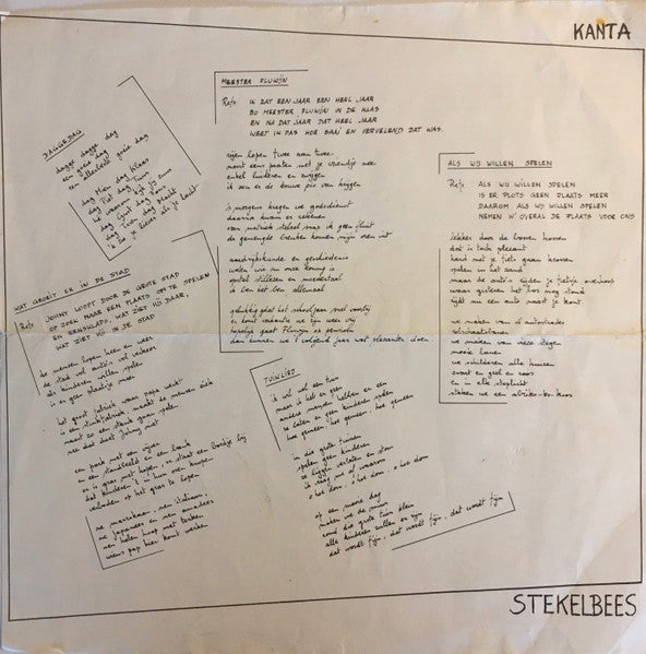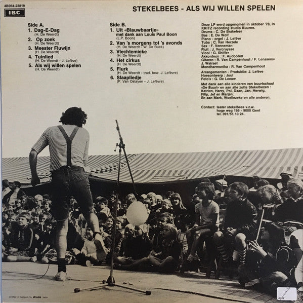 Issued with a printed insert with lyrics. —On labels— made in Belgium —On rear sleeve— Deze LP werd opgenomen in oktober '78, in KRITZ recording studio Kuurne. Met dank aan alle kinderen van buurtschool «De Buurt», en aan alle zotte Stekelbezen : Katrien, Harry, Pol, Daan, Jan, Herwig, Filip, Jef en Marjan. En aan Mark, Woeliezeke en alle anderen. Contact: teater stekelbees v.z.w. hoge weg 166 - 9000 Gent tel. 091/51.10.24 printed in belgium by druco halle