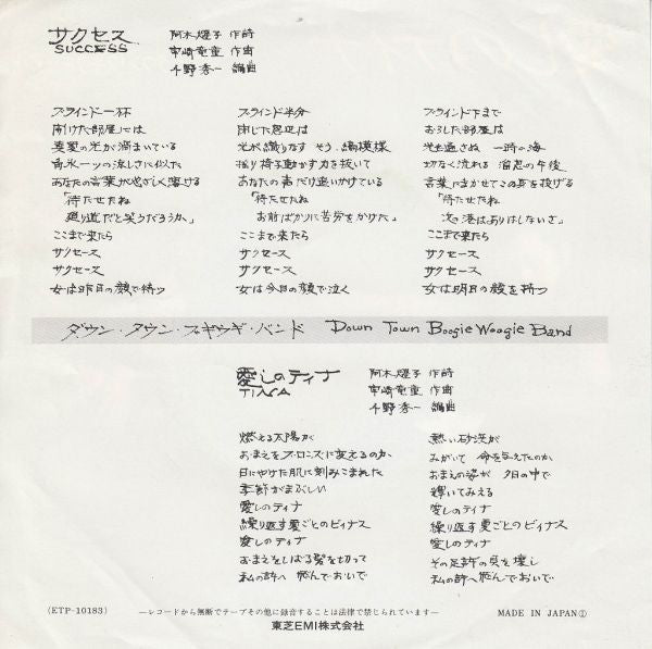 Down Town Boogie-Woogie Band = Down Town Boogie-Woogie Band - 愛しのティナ / サクセス (7", Single)