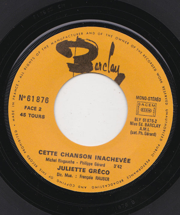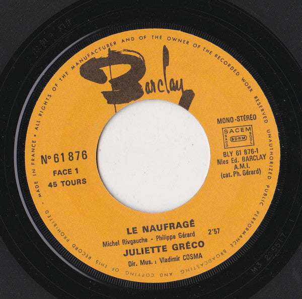 Juliette Gréco - Le Naufragé / Cette Chanson Inachevee (7", Single)