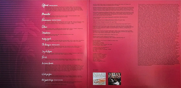 A Geffen Records release; ℗ 2006 © 2023 UMG Recordings, Inc., 2220 Colorado Avenue, Santa Monica, CA 90404 - U.S.A. All rights reserved. Unauthorised copying, reproduction, hiring, lending, public performance and broadcasting prohibited. Made in EU. LC01846. 00602458369946. Universal Music International B.V. 'S-Gravelandseweg 80, 1217 EW Hilversum, Netherlands. BIEM/SDRM. All lyrics by Nelly Furtado except "Promiscuous" lyrics by Attitude, Nelly Furtado and Timbaland and "Maneater" lyrics by Nelly Furtado with additional lyrics by Jim Beanz All songs produced by Timbaland for Timbaland Productions and Danja for Danja Handz Productions except "Showtime" produced by Danja for Danja Handz Productions and "No Hay Igual" produced by Timbaland for Timbaland Productions, Danja for Danja Handz Productions and Nisan Stewart for NCS Entertainment and "Te Busque" produced by Lester Mendez and "In God's Hands" produced by Rick Nowels and Nelly Furtado All Vocal Production by Jim Beanz for Sunset Entertainment/Pettaway Music except tracks 7 and 10. All songs Recorded at The Hit Factory Miami, Florida except "Te Busque" Recorded at Cubejam Miami, Florida, The Orange Lounge Toronto, Canada, The Hit Factory Miami, Florida and "In God's Hands" Recorded at The Chill Building Santa Monica, California, Track Record Hollywood, California, and Capitol Studios Hollywood, California All songs Mixed at Thomas Crown Studios Virginia Beach, Virginia except "Te Busque" Mixed at Larrabee North Studios North Hollywood, California, "Say It Right" and "Do It" Mixed at The Hit Factory Miami, Florida and "In God's Hands" Mixed at Henson Studios Los Angeles, California Mastered by Chris Gerhinger at Sterling Sound, Chelsea, New York Timbaland appears courtesy of Blackground Records LLC Juanes appears courtesy of [l36586, a division of [l272782 Management: Chris Smith Management Inc. www.chrissmithmanagement.com Tour/Agents: SL Feidman & Associates - Canada CAA - USA Helter Skelter - UK Track durations are not mentioned on the release. Gatefold Cover. 'Made in Czech Republic' sticker on plastic wrap.