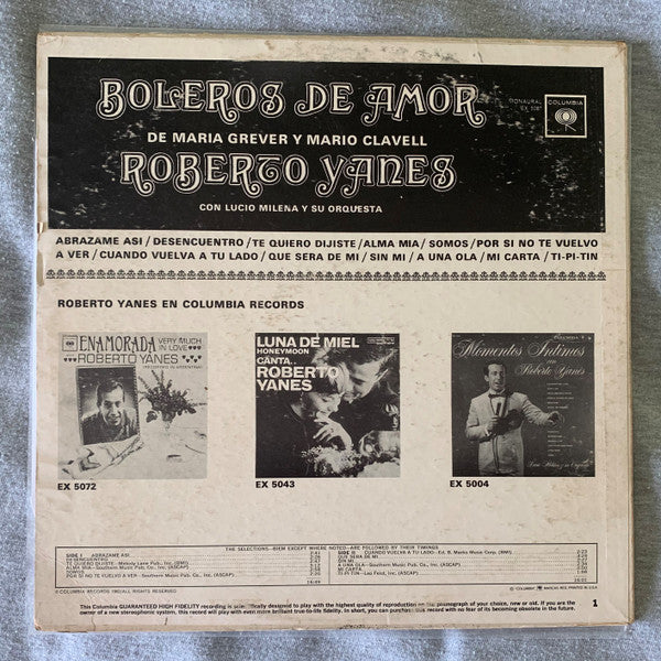 Roberto Yanes Con Lucio Milena Y Su Orquesta - Boleros De Amor De María Grever Y Mario Clavell (LP, Album, Mono)