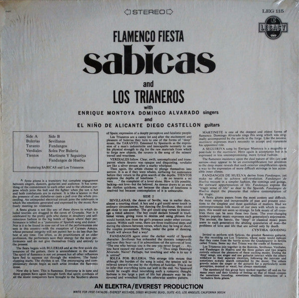 Main artist on sleeve back: "sabicas and Los Trianeros with Enrique Montoya Domingo Alvarado (singers) and El Niño De Alicante Diego Castellon (guitars)"