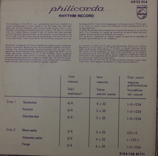The recording on this 33 ⅓ r.p.m. gramophone record are intended as a rhythm accompaniment to music played on the Philicorda. They have been made with the most frequently used forms of modern popular music in view. The refrain of the majority of these compositions consists of 32 bars or a multiple of 8, 12 or 16 bars. Hence a number of bars of rhythm have been recorded, such that the whole duration of each rhythm variation can be exploited to the full. In order to be able to start playing simultaneously with the rhythm of the record, a few beats, consisting of taps on the wood block, are given as a cue.