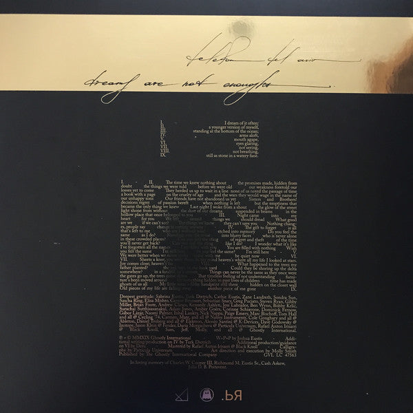 MMXIX Ghostly International W+P+P by Joshua Eustis Additional writing/production on IV by Turk Dietrich Additional production/guidance on VI by Deru Mastered by Rafael Anton Irisarri @ Black Knoll Calligraphy by Particula Universum Art direction and execution by Molly Smith Published by The Ghostly International Company GVL LC 47563 In loving memory of Charles W. Cooper III, Richmond M. Eustis Sr., Cash Askew, Julia D. B. Poitevent. ltd. transparent gold splatter vinyl includes download card 2200 copies pressed