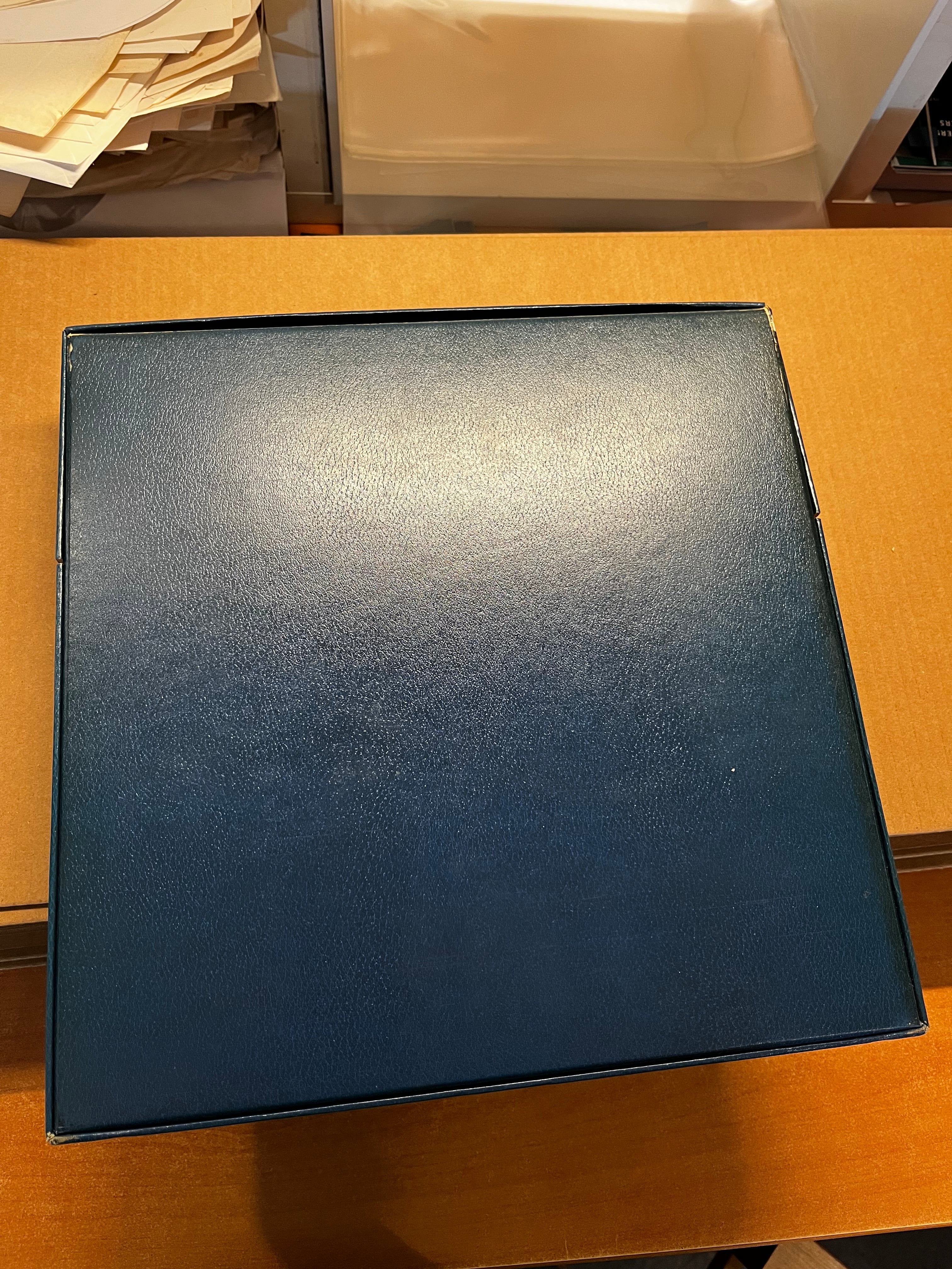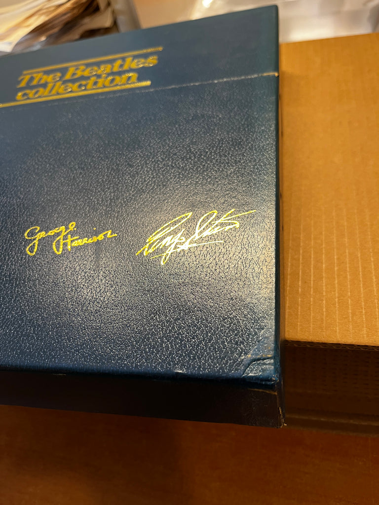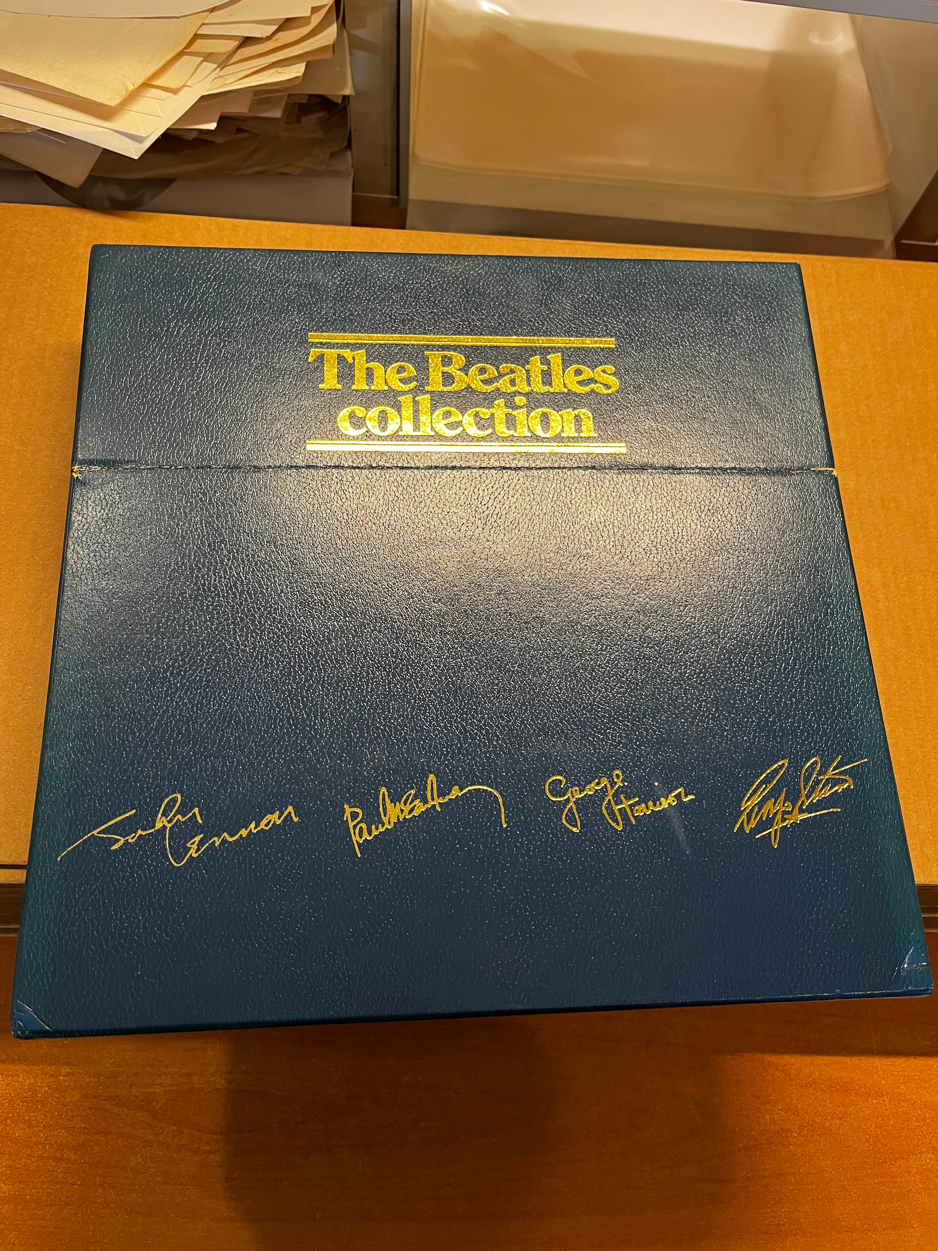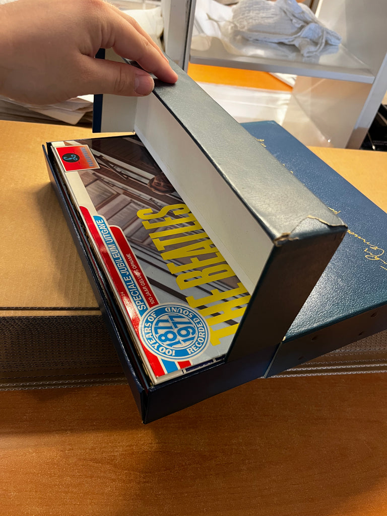 Dutch edition of The Beatles Collection. Comes in a blue imitation leather-cardboard box with golden etched letters containing the 14 original LPs:
