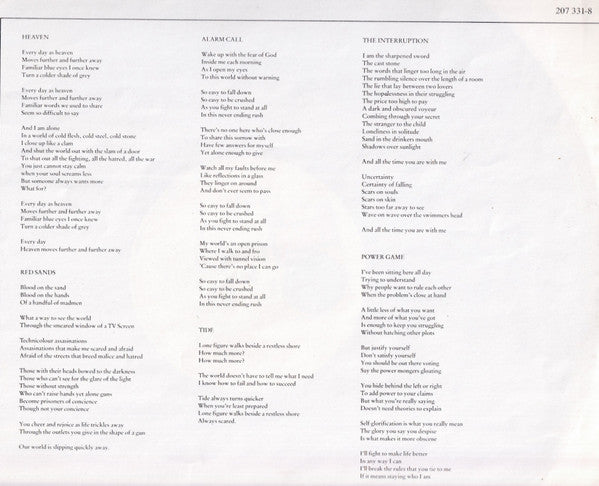 Released with a printed inner sleeve. All tracks were recorded at The Garden Studio London, during July 1985 except "The Power Game" which was recorded at The Point Studio, London during March 1985. Titles A1 to A5 published by Red Flame Music/Quiet Man Music. B1 published by Red Flame Music/Virgin Music (Publishers) Ltd. B2 to B4 published by Red Flame Music/10 Music Ltd. On sleeve: ℗ & © 1985 Ten Records Printed in Western Germany by TOPAC, Gesellschaft für Tonträger-Verpackung mbH, Gütersloh · Imprimé en République Fédérale d'Allemagne On labels: ℗ & © 1985 Ten Records Ltd. ---- Typo on sleeve and labels: "The Interuption" [Cat# variants center labels: 207 331 back cover: 207 331-620 inner sleeve: 207 331-8 ---- This release has a Pressing Plant ID bass clef on label side B. Similar release without bass clef: [r19477828
