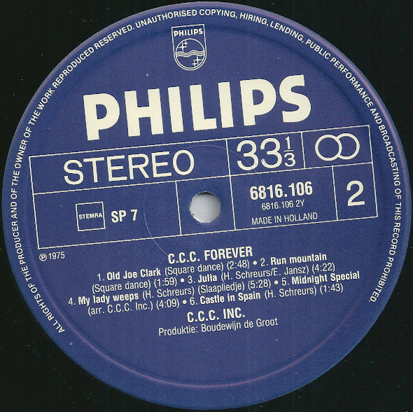 (P)1975 Catalog number on back sleeve and spine: Universe Productions SP-7 Catalog number on labels: Philips 6816.106 Recorded live at their farewell concert in the Shaffy Theater, Amsterdam on August 19, 1974. The runouts are stamped. Track A1: American Music Inc. Tracks A2, A4, A6, B4: Anagon Music Publ. Track A3: C. Williams/Publ. Co. Track A5: Acuff Rose Publ. Tracks B1, B2: No publisher mentioned Tracks B3, B5: New Dayglow The tracks are on the cover numbered from 1 to 11.