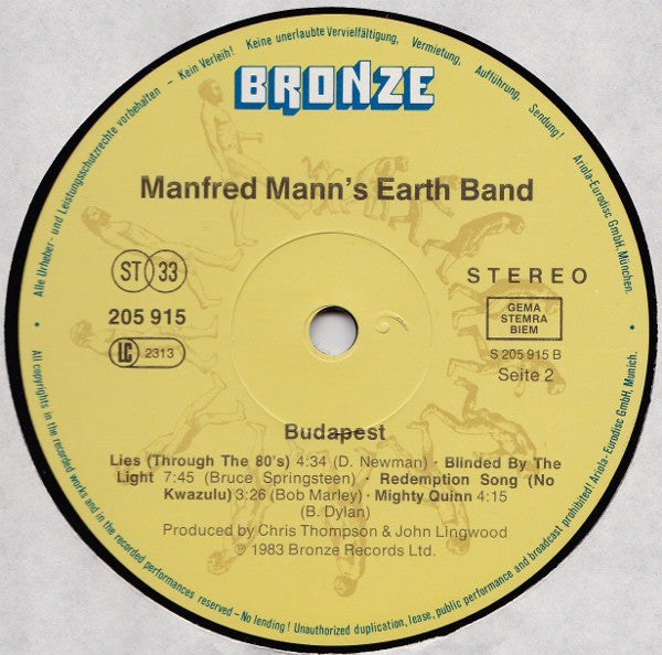 There is a similar release, without rights society BIEM. [MC logo 405915-352 Between February 8th and April 14th, 1983 Manfred Mann's Earth Band played to over 350,000 people at 50 shows in 10 European countries. Our thanks go to everyone who came and made the tour a sell-out success and especially the 30,000 in Budapest who made this album possible. Distributed by the Ariola Group of Companies. Printed in Western Germany by Mohndruck Graphische Betriebe GmbH, Gütersloh. Imprimé en Rébublique Fédérale d'Allemagne. ℗ & © 1983 Bronze Records Ltd. Recorded at Budapest Sporthalle - April 6/7 1983 Mixed at Workhouse 2, London Sept/Oct 1983. ℗ 1983 Bronze Records Ltd. Ariola-Eurodisc GmbH, Munich.