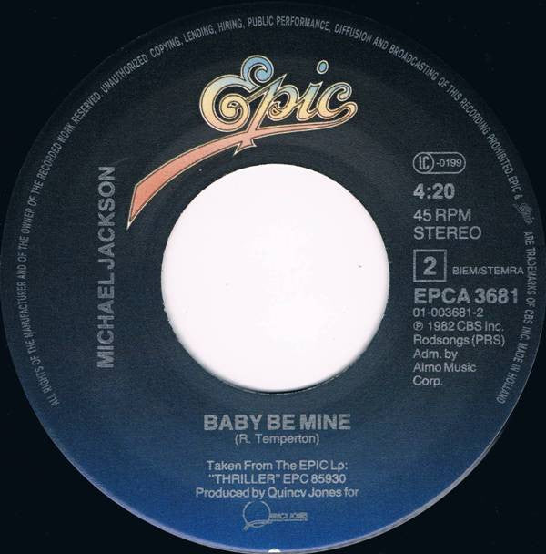 © 1983 CBS Inc. / ℗ 1982 CBS Inc. Made in Holland / Distribue en France par CBS Disques Taken from the #1 Epic LP "Thriller" EPC 85930 Time given on label for side A is 4:05, correct play length entered above.
