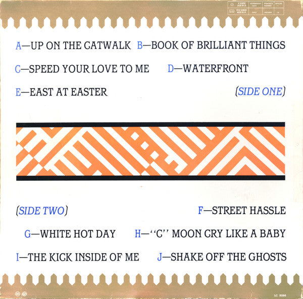 Printed inner sleeve. Track listing on release is A to J for A1 to B5. Some copies do not have the embossed bass clef on side B label. Some copies have a Direct Metal Mastering sticker on the front cover. Some copies may have a sticker with different French price code 'PM 262' on back cover. Sticker, front cover: Direct Metal® DMM Mastering Spine: ℗ 1983 Virgin Records Ltd © 1983 Virgin Records Ltd Inner sleeve: made in the United Kingdom, Autumn 1983 Kirsty MacColl (appears courtesy of Stiff Records) Labels: Published by EMI Publishing Ltd except [track B1 published by RCA Music Ltd ℗ 1983 Virgin Records Ltd © 1983 Virgin Records Ltd Virgin Records (rim text) Runouts: Stamped except Roman numerals which are etched.