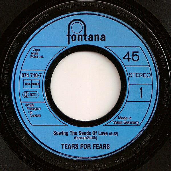 Centre labels: Virgin Music (Pubs) Ltd. ℗1989 Phonogram Ltd. (London) Made in West Germany Sleeve: Sowing The Seeds Of Love (7" Version) ℗ 1989 Phonogram Ltd. (London) © 1989 Phonogram Ltd. (London) Other info: This release has a big center hole & blue plastic Fontana center "labels", ie no paper labels. Runouts: - Runouts are stamped - Variant 2: 'A' crossed out on side A - Variants 2 & 3: '2' in '2W' stamped over false '1' on side B
