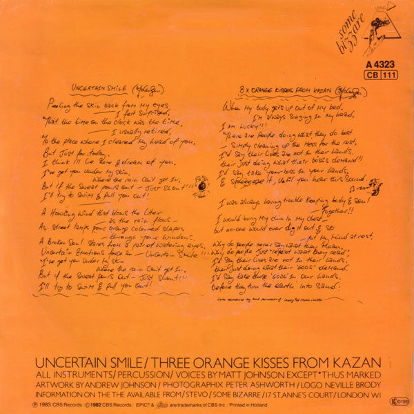 Catalogue number on back cover 'A 3423', on labels 'EPCA 3423'. Lyrics reproduced by kind permission of Cherry Red Music Limited. [Back cover ℗ 1983 CBS Records © 1982 CBS Records Printed in Holland [Labels Side A: Taken From The Epic Lp: "20901" EPC 25525 Made in Holland Printed duration side A (6:54) on label does not match the actual duration (6:45).