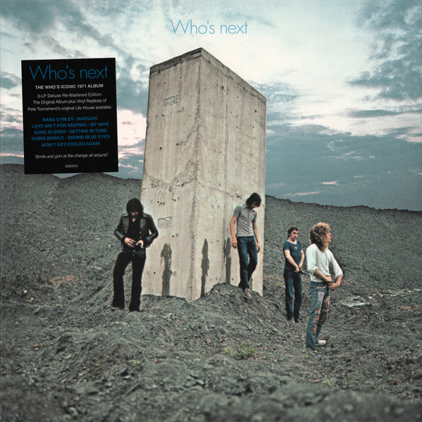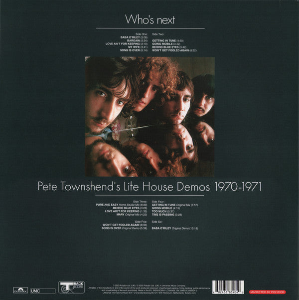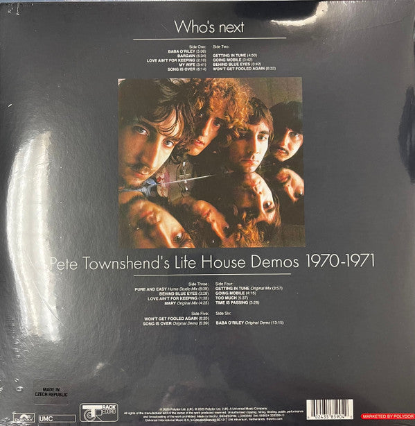 Hype sticker: Who's Next The Who's Iconic 1971 Album 3-LP Deluxe Re-Mastered Edition The Original Album plus Vinyl Replicas of Pete Townshend's Original Life House Acetates 'Smile and grin at the change all around' 3585904 ℗ 2023 Polydor Ltd. (UK). © 2023 Polydor Ltd. (UK). Jacket: Made in the EU. Labels: Made In The Czech Republic. A1 to B3: Recorded and mixed at Olympic Studios, London. B4 recorded at Stargroves and mixed at Island Studios, London. C1 to F1: All Demos performed and recorded by Pete Twonshend at Eel Pie Sound studio, Twickenham, 1970-71. D5 'Getting In Tune' listed as Original Mix on jacket, as Alternate Mix on inner sleeve.