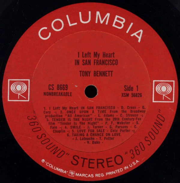Kerning on label may vary with some pressings having a new line between every track listing and "I Left My Heart IN SAN FRANCISCO" split into 3 lines rather than 2.