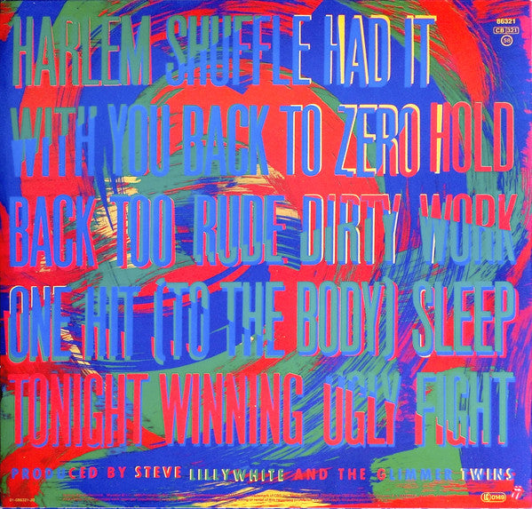 Matte cover. On some copies the inside cover is dark pink. Cardboard inner sleeve with lyrics and credits on one side and a comic strip, "Dirty Work Out", by Mark Marek on the other side + a generic inner sleeve with rounded corners too. Some copies were issued in dark red cellophane shrink-wrap with a large illustrated promotional sticker on the front. Track B6 is not listed. It is a short version of the Big Bill Broonzy blues standard. It's played by Ian Stewart who died shortly after this recording. Back cover: © 1986 Promotone B.V./ ℗ CBS Grammofoonplaten B.V. Made in Holland Labels: Made in Holland Inner sleeve: Recorded at Pathe Marconi Studios Paris Mixed at R.P.M. and Right Track Studios N.Y.C. Special thanks to: Bobby Womack.....Don Covay, Chuck Leavell, Jimmy Page, Patti Scialfa, Jimmy Cliff, Tom Waits, Kirsty MacColl, Ivan Neville, Anton Fig, Steve Jordan, Charley Drayton, Philippe Saisse, Dan Collette, John Regan, Alan Rogan, Ian Stewart, Janis Pendarvis, and Dolette McDonald Bobby Womack appears courtesy of MCA Records. Don Covay appears courtesy of Rawstock Productions. Jimmy Page appears courtesy of Atlantic Records. Tom Waits appears courtesy of Island Records. Kirsty MacColl appears courtesy of Stiff Records. Ivan Neville appears courtesy of Island Records. Philippe Saisse appears courtesy of Manhattan Records and Doppelganger. Thanks to Sterling at the Ernie Ball Co. for strings and things. Thanks to Tony King and Jane Rose. This album is dedicated to Ian Stewart "Thanks, Stu, for 25 years of boogie-woogie." All songs © 1986 Promopub B.V. (PRS) except A5 © 1983 Half Pint Music A3 © 1969 Marc-Jean Music (administered by Bug) & Keymen Music (BMI). Runouts: The sequence AL/BL 40250-1xx is etched; The sequence 01-86321-xx-1 + the isolated letter (A, B, C or D) are stamped