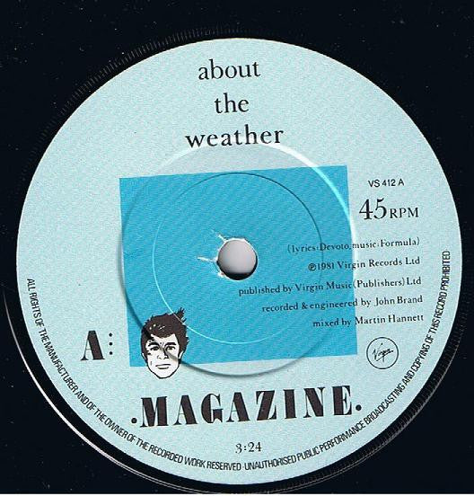 Performance credits are not printed on the release itself—these are taken from 'Magic, Murder and the Weather' and 'Scree' respectively. Information in the runouts is etched bar 'TOWNHOUSE' and succeeding digits (and 'Λ') which are stamped.