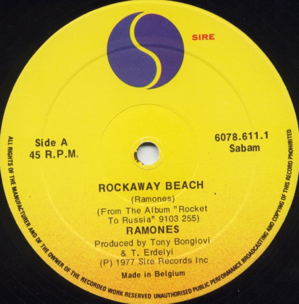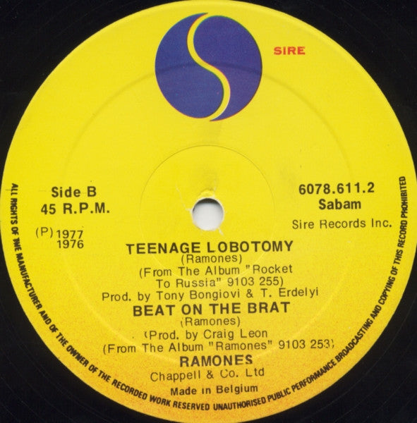 Issued in a flat sleeve with no spine. A, B1: From The Album "Rocket To Russia" 9103 255 B2: From The Album "Ramones" 9103 253 A: (P) 1977 Sire Records Inc B: (P) 1977 1976 Sire Records Inc Made in Belgium