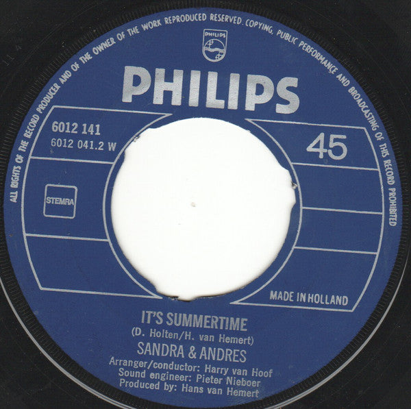 Sandra & Andres - Que Je T'aime / It's Summertime (7", Single, Pap)