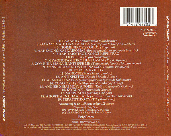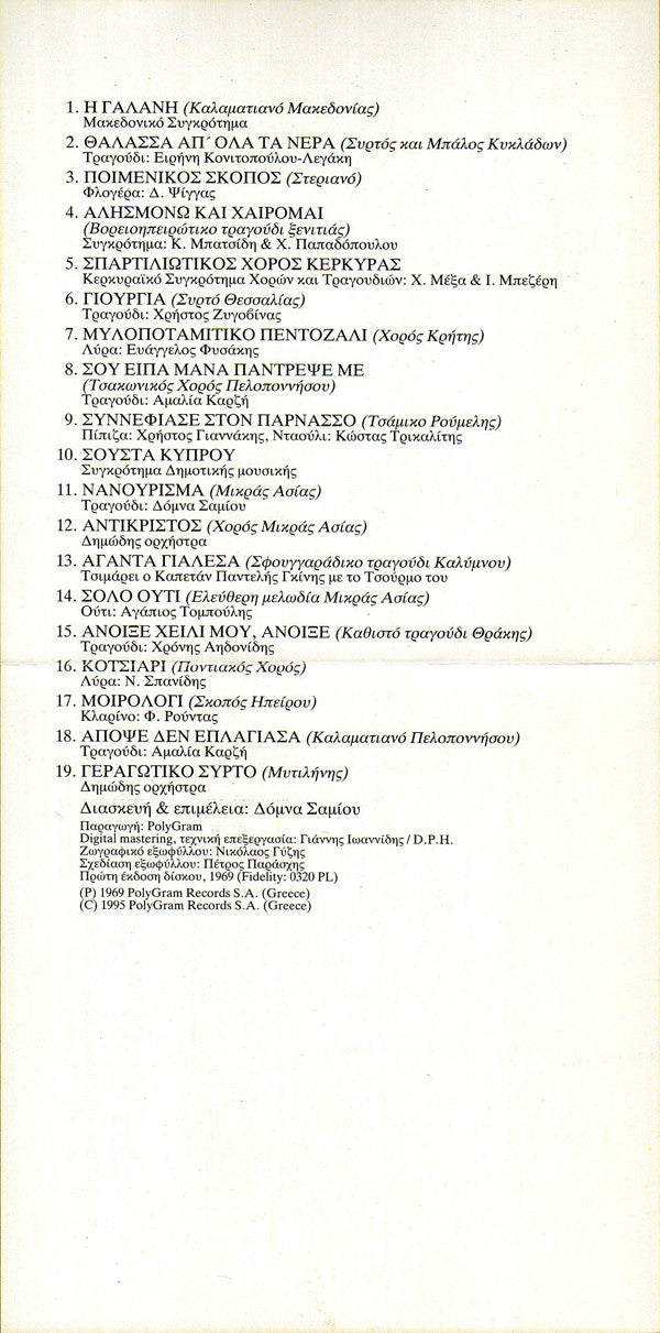First Release on vinyl was in 1969. Domna Samiou in 19 songs from all around Greece.