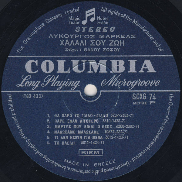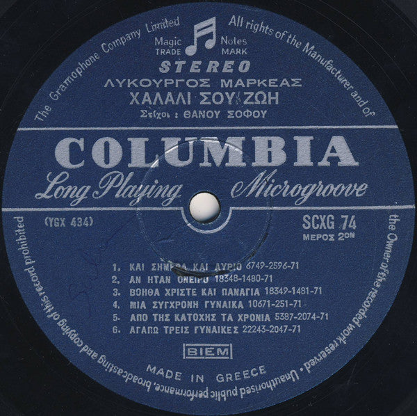 The Gramophone Company Limited Made in Greece. On front cover first and second main artist are listed in genitive. On back cover liner notes (author unknown) and tracklist are listed in both Greek and English. All wording originally in polytonic orthography.