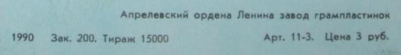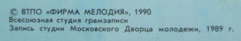 © ВТПО "ФИРМА МЕЛОДИЯ", 1990 Запись студии Московского Дворца молодежи. 1989 г. Апрелевский ордена Ленина завод грампластинок. 1990 Арт. 11-3. Цена 3 руб. variant 1: Зак. 200. Тираж 15000 variant 2: Зак. 266. Тираж 30000 variant 3: Зак. 130. Тираж 26000 Гр. 3. 2-25 Год выпуска 1990 (On labels) White labels
