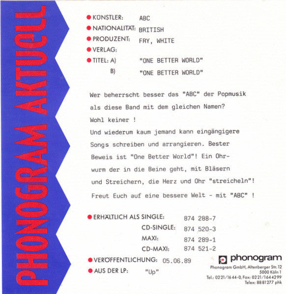 ℗ 1989 Phonogram Ltd. (London) Made in West Germany Textured sleeve. Some copies with German phonogram aktuell promo insert.