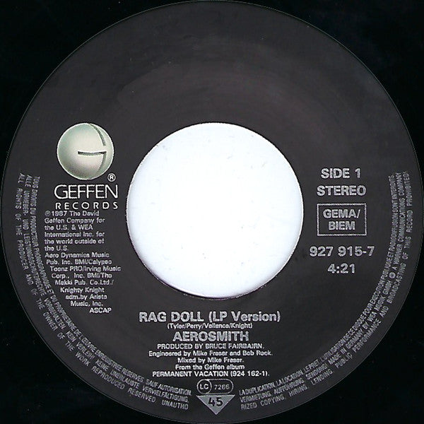 [labels: A: Aero Dynamics Music Pub., Inc. BMI/Calypso Toonz PRO/Irving Music Corp., Inc. BMI/The Makki Pub. Co.Ltd./Knighty Knight adm.by Arista Music, Inc. ASCAP B: Aero Dynamics Music Pub., Inc. BMI ℗ 1987 The David Geffen Company for the U.S. and WEA International Inc. for the world outside of the U.S. From the Geffen album PERMANENT VACATION (924 162-1) Made in Germany by WEA Musik GmbH [logo A Warner Communications Company [sleeve: [... Geffen Records, manufactured exclusively by Warner Bros. Records Inc. ©1988 ℗1987 The David Geffen Company. Manufactured in Germany · Pressé en Allemagne. TELDEC Record Service GmbH [logo A Warner Communications Company _ 2nd sleeve variant, now crediting TELDEC Record Service GmbH as manufacturer. Price code appears as 'France WE 171' [r=11870337: 1st sleeve variant, crediting Record Service GmbH as manufacturer. Price code WE 171 without 'France'. [r=453805: 3rd sleeve variant with cassette single reference on the front.