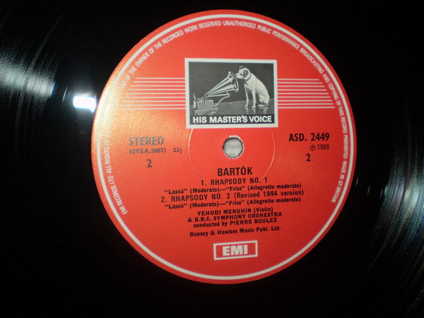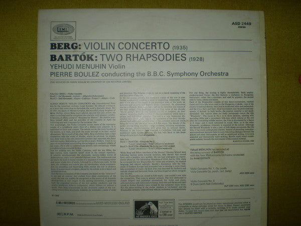 Sleeve, verso: "The services of Pierre Boulez by courtesy of CBS Records Limited." Record company given as "E.M.I. Records (The Gramophone Company Ltd), Hayes, Middlesex, England." "Nipper" reappears as black-and-white image, as "Regd. Trade Mark of The Gramophone Company Ltd.: A Company of the EMI Group." Older EMI globe logo above legend "The Greatest Recording Company in the World" at top left.