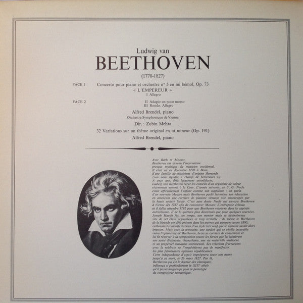 Alfred Brendel, Ludwig van Beethoven, Wiener Symphoniker, Zubin Mehta - Concerto Pour Piano L'Empereur / 32 Variations (LP, RE)