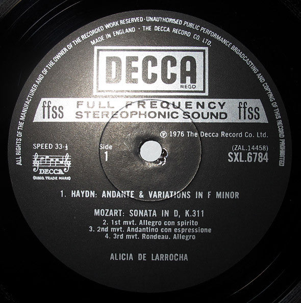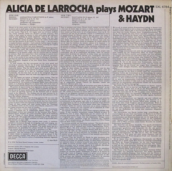 A1. Joseph Haydn, Alicia De Larrocha - Andante & Variations In F Minor . Wolfgang Amadeus Mozart, Alicia De Larrocha - Sonata In D, K.311 B1. Wolfgang Amadeus Mozart, Alicia De Larrocha - Fantasia In D Minor, K.397 . Wolfgang Amadeus Mozart, Alicia De Larrocha - Sonata In C, K.330