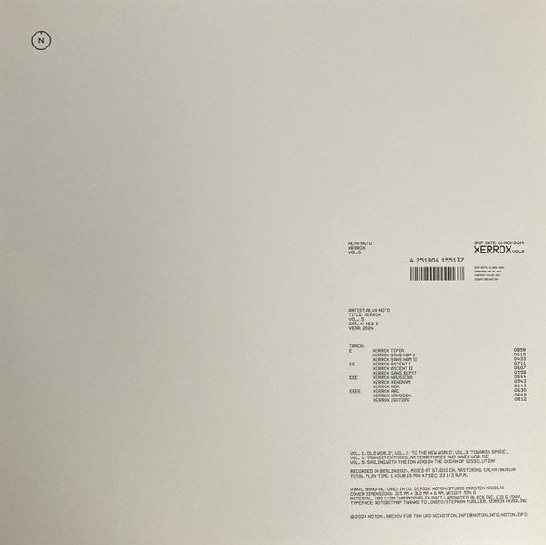 Vol. 1: 'Old World', Vol.2: 'To The New World', Vol.3: 'Towards Space', Vol.4: 'Transit Extrasolar Territories and Inner Worlds', Vol.5: 'Sailing with the Ion Wind in the Ocean of Dissolution' Recorded in Berlin 2024, mixed at Studio CN, Mastering: Calyx/Berlin Total play time: 1 hour 19 min 47 sec, 33 1/3 RPM Vinyl manufactured in EU, design: NOTON/Studio Carsten Nicolai Cover dimensions: 315 mm x 312 mm x 6 mm, Weight: 554 g Material: 280 g/qm chromoduplex matt laminated, black inc, 130 g vinyl Typeface: Notobitmap thanks to Lineto/Stephan Murller, Xerrox Headline © 2024 noton.archiv für ton und nichitton, info@noton.info, noton.info