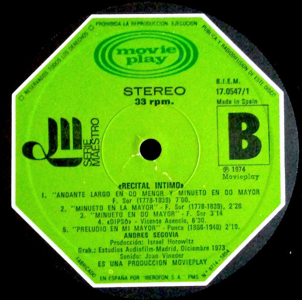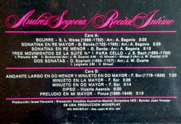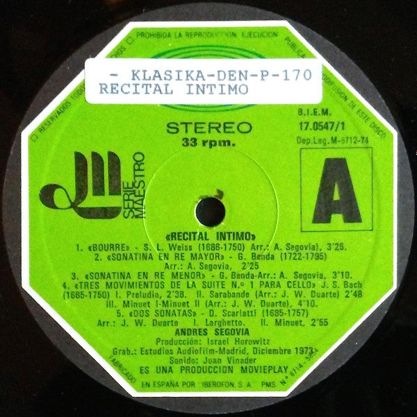 Andrés Segovia - Recital Intimo (LP, Album, Gat)