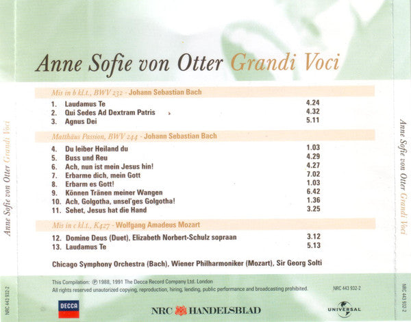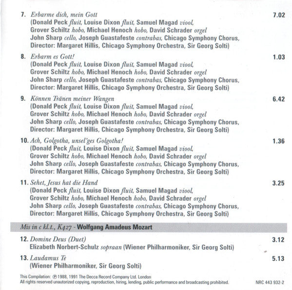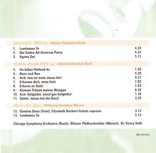 . Mass In B Minor, Bwv 232 1. Laudamus Te 4:242. Qui Sedes Ad Dextram Patris 4:323. Agnus Dei 5:11. Matthäus Passion, Bwv 244 4. Du Leiber Heiland Du 1:035. Buss Und Reu 4:296. Ach, Nun Ist Mein Jesus Hin 4:277. Erbarme Dich, Mein Gott 7:028. Erbarm Es Gott! 1:039. Künnen Tränen Meiner Wangen 6:4210. Ach Golgotha, Unsel'ges Golgotha! 1:3611. Sehet, Jesus Hat Die Hand 3:25. Mass In C Minor, K427 12. Domine Deus (Duet) 3:1213. Laudamus Te 5:13