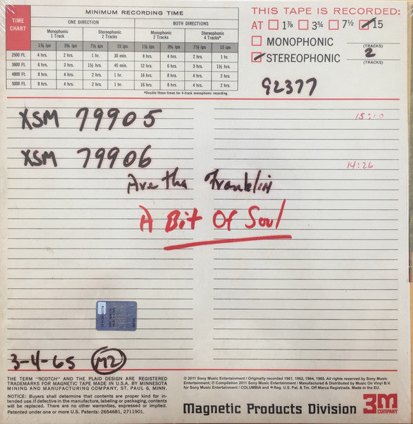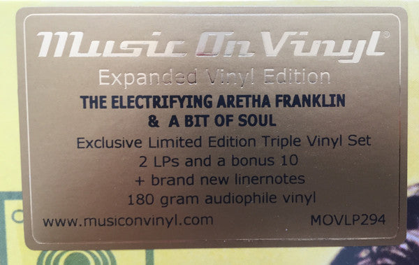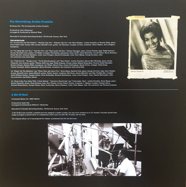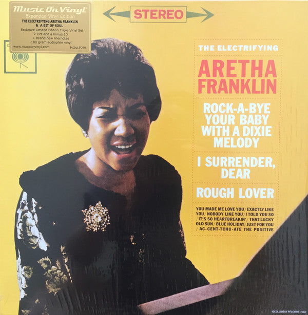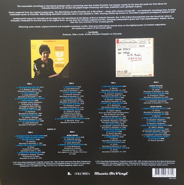 A1. You Made Me Love You 2:17 A2. I Told You So 2:41 A3. Rock-A-Bye Your Baby With A Dixie Melody 2:22 A4. Nobody Like You 2:21 A5. Exactly Like You 2:35 A6. It's So Heartbreakin' 2:38 B1. Rough Lover 2:45 B2. Blue Holiday 2:52 B3. Just For You 2:11 B4. That Lucky Old Sun 3:18 B5. I Surrender, Dear 2:45 B6. Ac-cent-tchu-ate The Positive 2:16 . The Electrifying Aretha Franklin - Bonus Tracks C1. Introduction To Hard Times 0:31 C2. Hard Times (No One Knows Better Than I) (Take 2) 3:08 C3. When They Ask About You 2:59 C4. Operation Heartbreak 2:59 D1. I Surrender, Dear (Mono Mix) 2:46 D2. Rough Lover (Mono Mix) 2:47 D3. Kissin' By The Mistletoe (Mono Mix) 2:22 . A Bit Of Soul E1. Follow Your Heart 2:26 E2. Only The One You Love 2:24 E3. One Step Ahead 2:34 E4. Can't You Just See Me 2:03 E5. How To Murder Your Wife 2:55 E6. A Little Bit Of Soul 2:21 E7. Cry Like A Baby 2:13 E8. Her Little Heart Went To Loveland 2:34 E9. Remember Me 2:13 E10. Land Of Dreams 2:14 E11. Little Miss Raggedy Ann 2:10 F1. Deeper 2:12 F2. I Still Can't Forget 2:55 F3. Rose Of Washington Square 2:38 F4. Take It Like You Give It (Mono Mix) 1:53 F5. Follow Your Heart (Mono Mix) 2:26 F6. Only The One You Love (Mono Mix) 2:22 F7. One Step Ahead (Mono Mix) 2:27 F8. How To Murder Your Wife (Mono Mix) 2:49 F9. A Little Bit Of Soul (Mono Mix) 2:18 F10. Cry Like A Baby (Mono Mix) 2:06 F11. Her Little Heart Went To Loveland (Mono Mix) 2:35