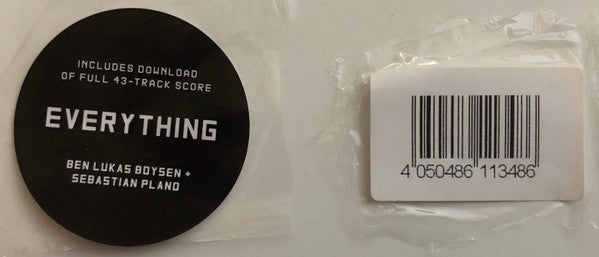 Black sticker: "Includes download of full 43-track score / Everything / Ben Lukas Boysen + Sebastian Plano - code on white sticker on the inner sleeve.