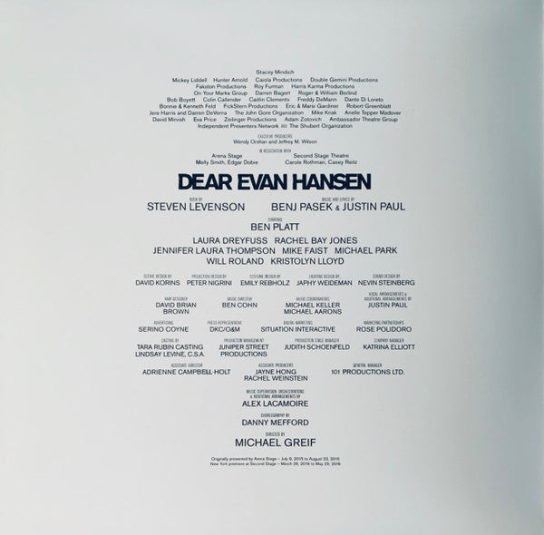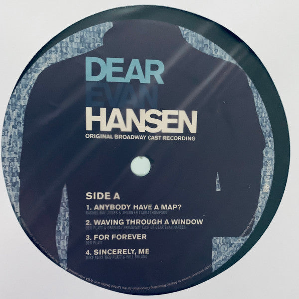 A1. Rachel Bay Jones, Jennifer Laura Thompson - Anybody Have A Map? 2:26 A2. Ben Platt (2) - Waving Through A Window 3:56 A3. Ben Platt (2) - For Forever 5:01 A4. Mike Faist, Ben Platt (2), Will Roland (3) - Sincerely, Me 3:42 B1. Laura Dreyfuss, Michael Park (3), Jennifer Laura Thompson - Requiem 4:19 B2. Ben Platt (2), Laura Dreyfuss - If I Could Tell Her 4:08 B3. Ben Platt (2), Mike Faist, Kristolyn Lloyd, Will Roland (3), Jennifer Laura Thompson - Disappear 4:35 C1. Ben Platt (2), Kristolyn Lloyd, Will Roland (3), Laura Dreyfuss - You Will Be Found 6:00 C2. Michael Park (3), Ben Platt (2) - To Break In A Glove 3:50 C3. Laura Dreyfuss, Ben Platt (2) - Only Us 3:47 D1. Rachel Bay Jones, Kristolyn Lloyd, Will Roland (3), Ben Platt (2) - Good For You 3:05 D2. Ben Platt (2) - Words Fail 5:51 D3. Rachel Bay Jones - So Big / So Small 4:12 D4. Ben Platt (2) - Finale 1:35