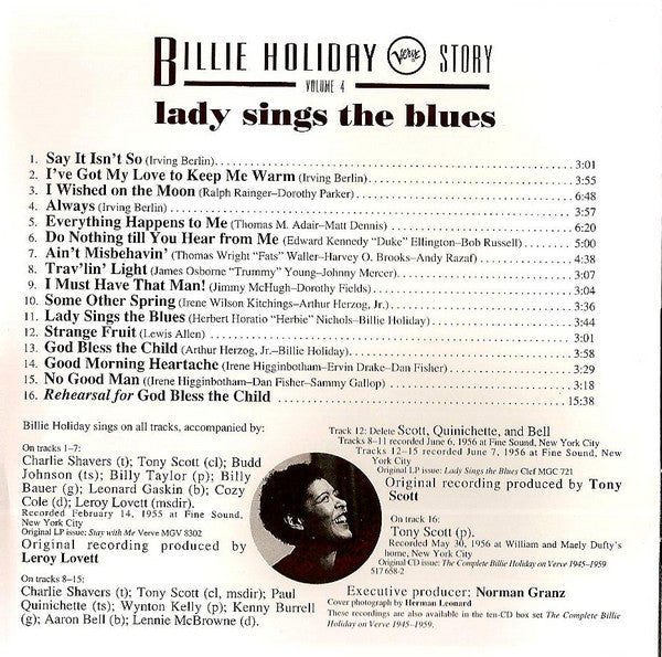 Tracks 8-16: Recorded June 6 and 7, 1956 at Fine Sound, New York City. OriginalLP issue: "Lady Sings The Blues", Clef MGC 721.