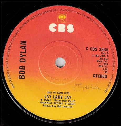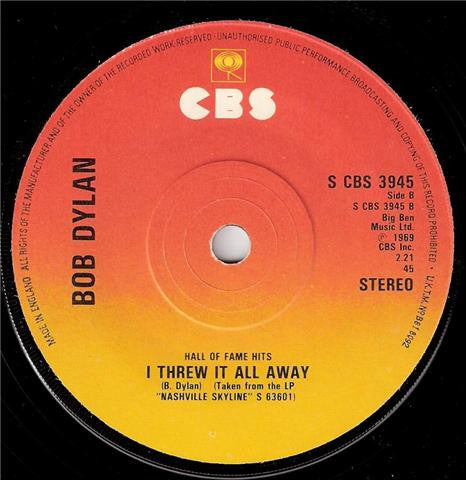 Standard company sleeve. Hall of Fame Hits Taken From The LP "Nashville Skyline" (S) 63601 Big Ben Music Ltd. ℗ 1969 CBS Inc. Made In England.