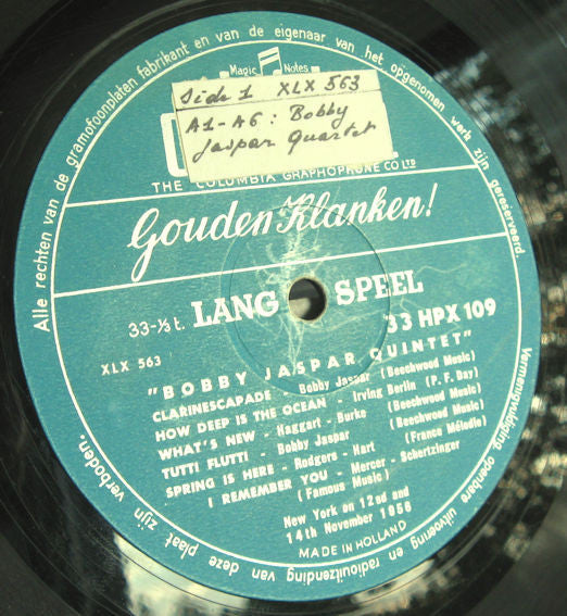 Note: A French release has exactly the same Matrix/Runout #s as this Dutch release. On the rear of the sleeve however the track lists are inverted: "Wee Dot" to "They Look Alike" are on Side 1 (XLX 564); "Clarinescapade" to "I Remember You" are on Side 2 (XLX 563). The four members of the Quartet (Jaspar, Flanagan, Totah and Jones) are mentioned on the back of the sleeve as well as the members of the Quintet (Jaspar, Galbraith, Costa, Hinton and Johnson.)