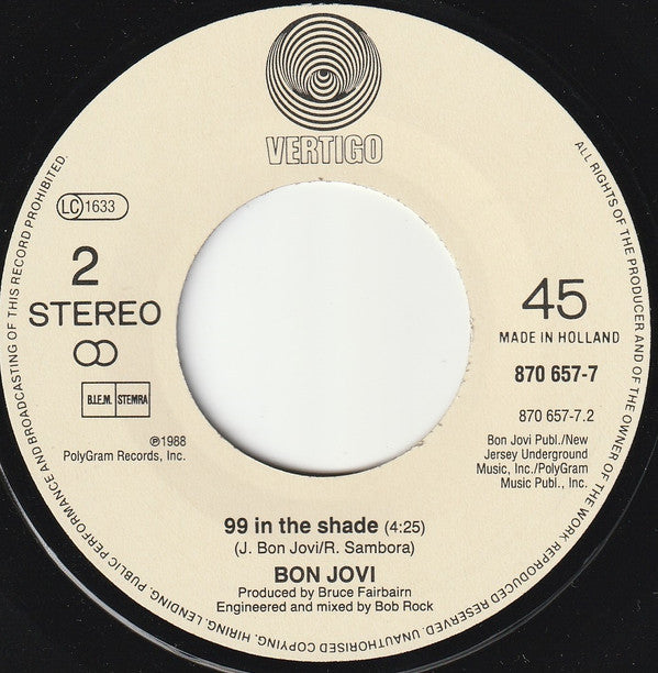℗ 1988 PolyGram Records, Inc. © 1988 PolyGram Records, Inc Stereo. Made in Holland. Phonographic Copyright (p) – PolyGram Records, Inc. Side A: Published Bon by Jovi Publishing/New Jersey Underground Music, Inc./PolyGram Music Publishing, Inc./Desmobile Music/SBK/April Music Inc. Side B: Published Bon by Jovi Publishing/New Jersey Underground Music, Inc./PolyGram Music Publishing.