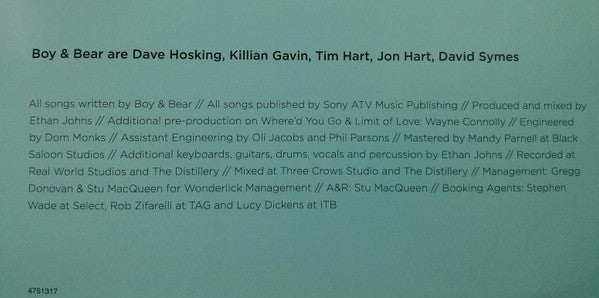 Back cover's bottom right includes Island and Netwerk logos.  Inner sleeve includes "Boy & Bear are Dave Hosking, Killian Gavin, Tim Hart, Jon Hart, David Symes" and "Additional keyboards, guitars, drums, vocals and percussion by Ethan Johns."