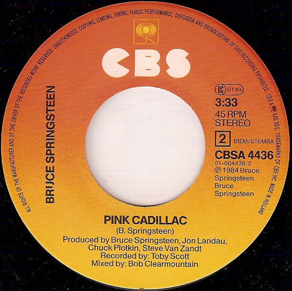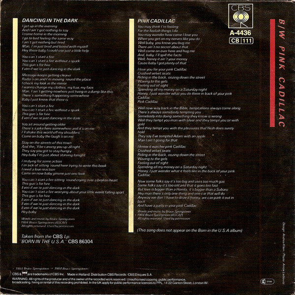 On back cover : A&B Words and music by Bruce Springsteen © 1984 Bruce Springsteen (ASCAP) A Taken from the CBS Lp: "Born in the U.S.A." CBS 86304 B This song does not appear on the Born In The U.S.A. album © 1984 Bruce Springsteen / ℗ 1984 Bruce Springsteen Made in Holland. Distribution CBS Records / CBS Disques S.A. On labels : Made in Holland