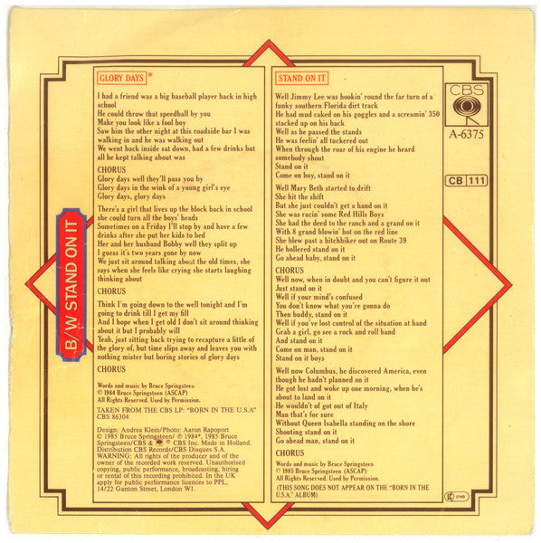 Exist with sunburst and red labels. Track A Taken from the CBS LP "Born in the U.S.A." CBS 86304 © 1985 Bruce Springsteen/ ℗ 1984 [Track A, 1985 Bruce Springsteen Made in Holland Distribution CBS Records/CBS Disques S.A.
