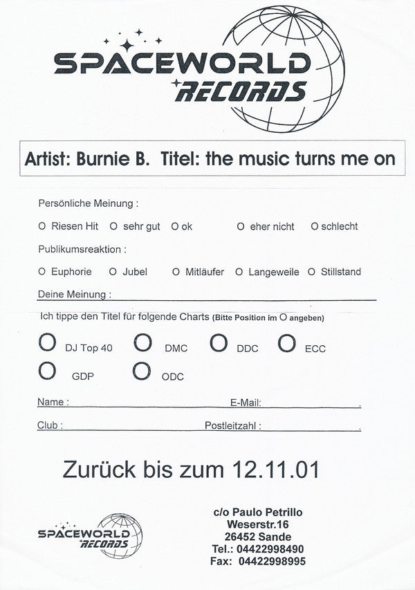 Stamped white label promo copy, which was released together with a promo/press sheet and a DJ reaction sheet.