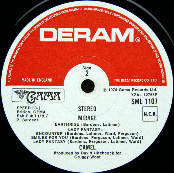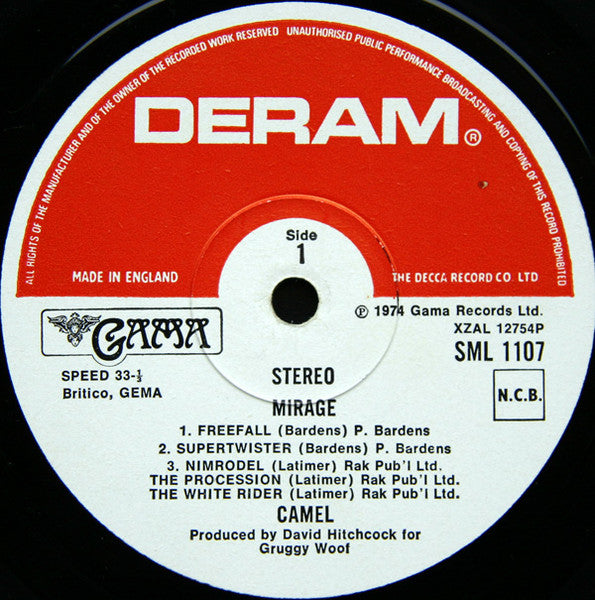 Matte sleeve. Includes printed paper insert with band photos, track listing and credits with 'Ⓢ SML 1107'. Standard polylined Decca inner sleeve. ℗ 1974 Gama Records Ltd. Backing tracks recorded at Island Studios Overdubs recorded at Decca No. 2 studio and AIR Studios Re-mixed at AIR Studios 'A GAMA RECORDS PRODUCTION' Sleeve printed in England by Robert Stace. Insert printed in England by Senol Printing Limited Made in England Publishing: • P. Bardens - A1, A2. • Rak Pub'l Ltd. - A3. • Rak Pub'l Ltd. / P. Bardens - Side B. Release date as recorded in the book "Camel, every album, every song" by Hamish Kuzminski. SonicBond, 2021. Runouts are stamped.