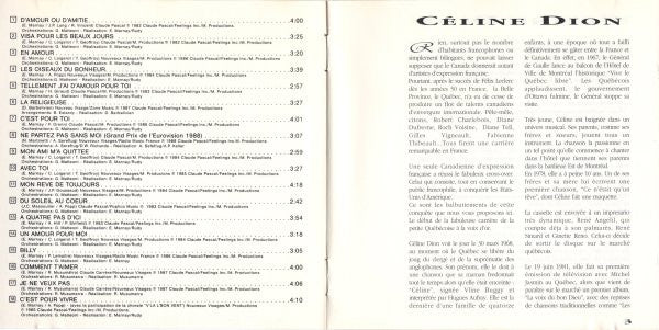 Liner notes are excerpts from a biography of Céline Dion published in "Le magazine de la Variété française et internationale". Novembre 1993.