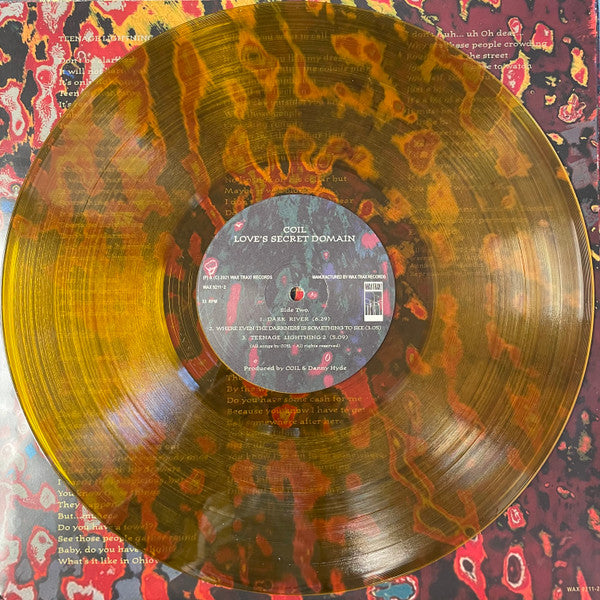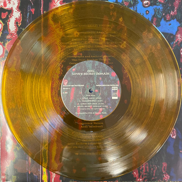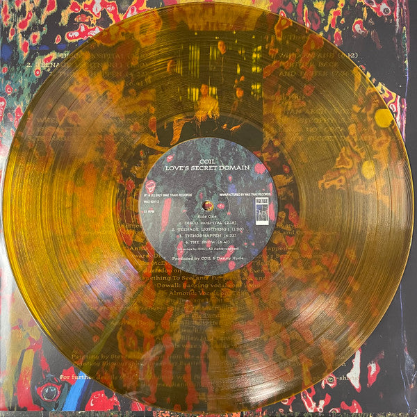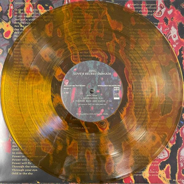 Amber edition of 2900 copies in a full color spot-gloss gatefold with front cover Hype sticker. Initial preorders could be ordered with an exclusive shirt. Booklet contains an essay written by Drew Daniel of Matmos titled The Side Effects of Life: Love's Secret Domain, Then and Now which has small interviews with Stephen Thrower, Rose McDowall, Marc Almond, Billy McGee, Charles Hayward, Little Annie Bandez, and Danny Hyde. Comes with 2 stickers: 1 x Wax Trax! Records, 1 x Coil and an A3 double sided 3 colour Wax Trax! Records postcard.