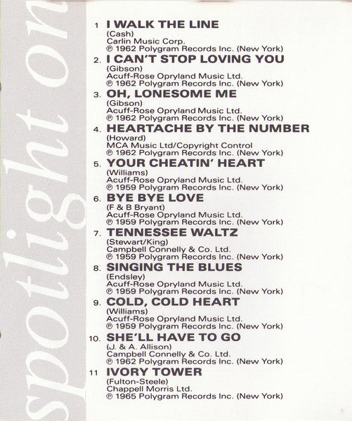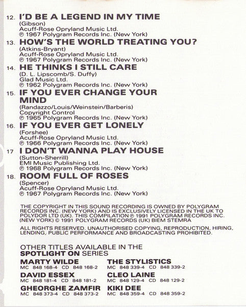Album compiler Ron Roberts successfully requested that this be the only compilation in the "Spotlight On..." series to be given its own sub-title. The set, therefore, carries the tags "A LEGEND IN HER TIME" and "The Country Hits".